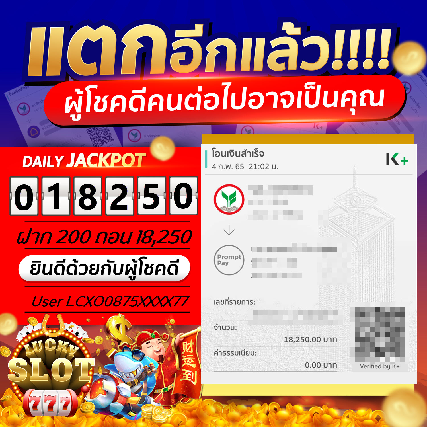 Jackpot วันที่ 04 ก.พ. 65 ยูส LCXO0875XXXX77 ฝาก 200 ถอน 18,250