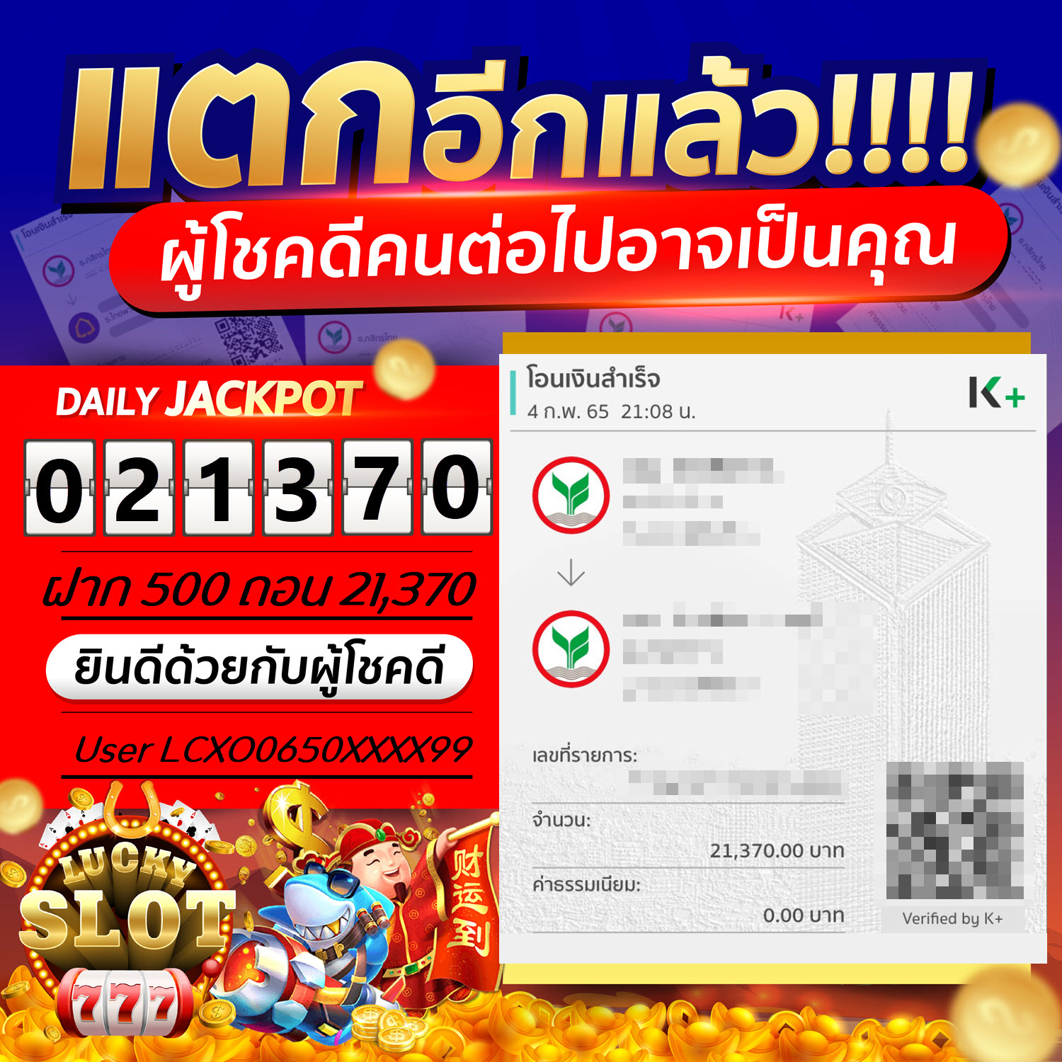 Jackpot วันที่ 04 ก.พ. 65 ยูส LCXO0650XXXX99 ฝาก 500 ถอน 21,375